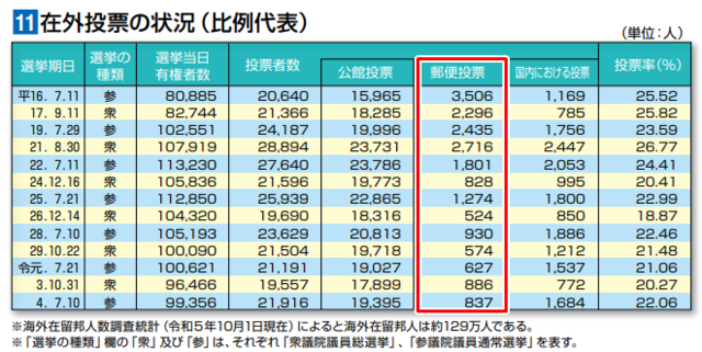 According to the 'Status of Overseas Elections in Japan' of the Ministry of Internal Affairs and Communications, the turnout of overseas elections in Japan from the mid-term elections in 2000, when overseas elections were introduced, to the latest, has generally been in the early to mid-20% range. Even after the 2004 Upper House election, when the number of eligible voters by mail was completely expanded, there was no noticeable increase in turnout. There is also a tendency to decrease the rate of mail-in voting.